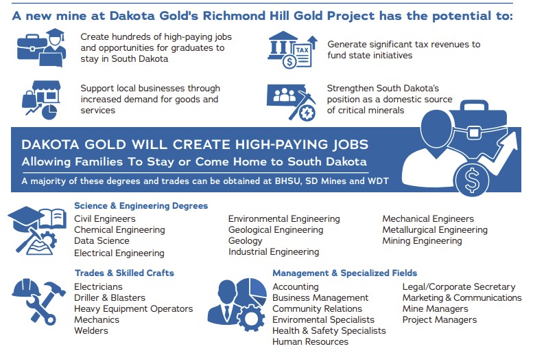 Dakota Gold has 37 full time employees of which 92% are local, as well as 1 part time employee and 50 contractors as at Dec 2024. Available internships and career positions can be found here: dakotagoldcorp.com/contact-us/careers/