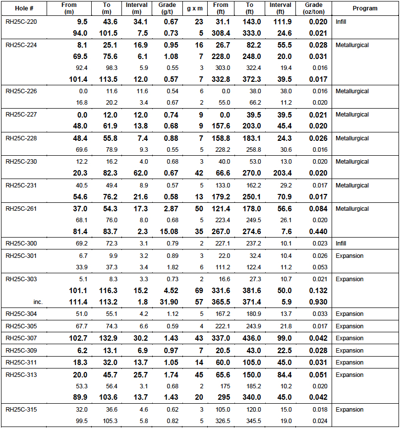 - Expansion and infill drill holes RH25C-303 intersected 4.52 grams per tonne gold (g/t Au) over 15.2 meters (69 gram meters), including 31.90 g/t Au over 1.8 meters (57 gram meters), RH25C-307 intersected 1.43 g/t Au over 30.2 meters (43 gram meters) and RH25C-313 intersected 1.74 g/t Au over 25.7 meters (45 gram meters). The first two drill holes listed were located 50 meters (165 ft) and 100 meters (330 ft) north respectively of the current Measured and Indicated resource boundary. The mineralization in the northeast is only limited by drilling and remains open. The Company has drill-tested the area up to 300 meters (980 ft) north and 535 meters (1,750 ft) wide.