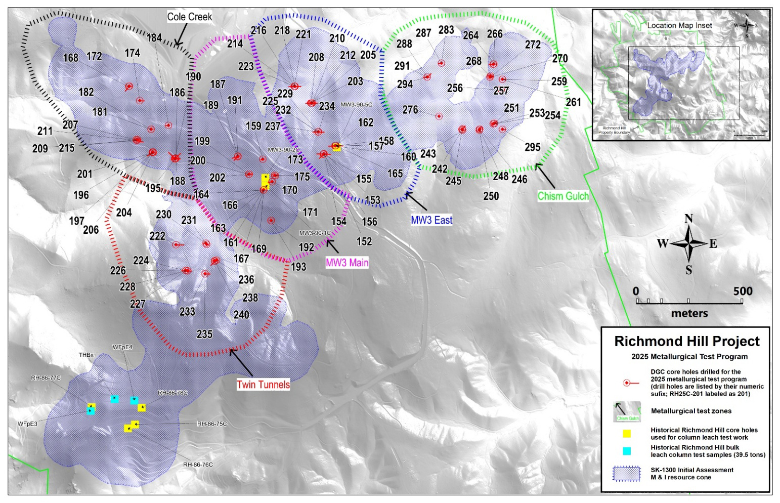 - High-grade areas potential for early mining. The Company is evaluating mine plan sequence opportunities in the FS and will update the resource in 2026 to include 200 drill holes completed in the 2025 drill campaign. The two columns tested from the MW3 zone graded 0.96 grams per tonne gold (“g/t”) (“Au”) and 23.1 g/t silver (“Ag”), and 0.53 g/t Au and 17.3 g/t Ag, respectively. The current resource model for the MW3 zone does not yet include high-grade intercepts reported from drilling in 2025, such as RH25C-164 intersecting 1.94 g/t Au over 60.0 meters (116 gram meters) and RH25C-169 intersecting 2.78 g/t Au over 39.3 meters (109 gram meters).